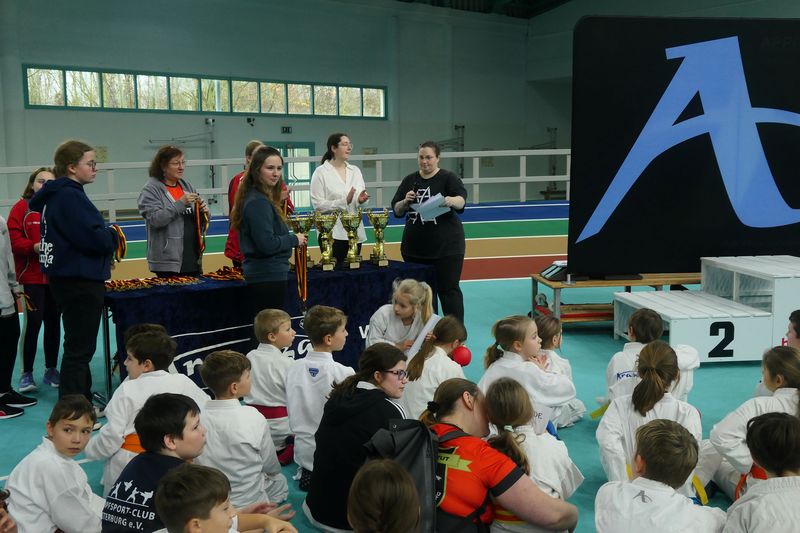 Kamen die bis einschließlich Frühjahr des Jahres 2025 durchgeführten Wettbewerbe in Kata und Kumite meist mit zwei Matten in lokalen Sporthallen aus und waren in der Regel am frühen Nachmittag eines jeden Turniertages beendet, musste beim Nachwuchscup am 13. Dezember 2025 die, dankenswerterweise von der Stadt zur Verfügung gestellte Brandbergehalle in Halle dafür herhalten, in der sich vom Vormittag bis zum Übergang des Nachmittags zum Abend unter den Augen der Kampfrichter auf drei Matten rund 100 Starter aus 11 Vereinen spannende und teilweise für deren Alter auch qualitativ sehr hochwertige Kämpfe lieferten.